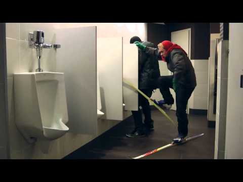 Corey attempts to use the urinal without removing his Skis, causing annoyance to those around him.